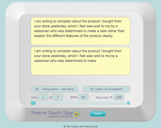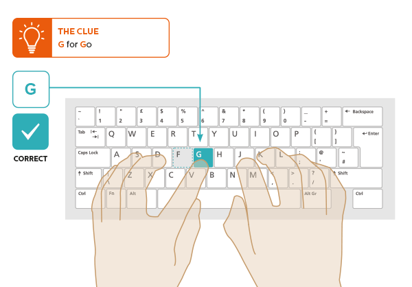 As new letters are introduced there is a short, clear and concise lesson. At the heart of the lessons are the clues, which gradually build up a mental picture of the keyboard. Again, the graphics are clean and uncomplicated. The animation presents the finger movement with complete clarity and the user can mimic this movement on the keyboard before moving to the Work-Screen. A voiceover completes the multisensory experience. The tone is often humorous, but never patronising to young learners.